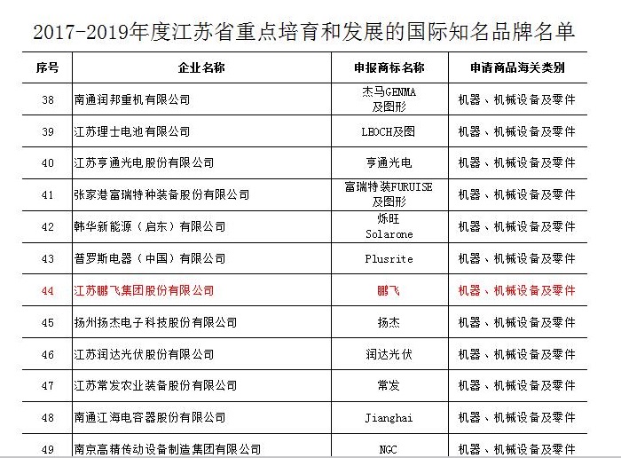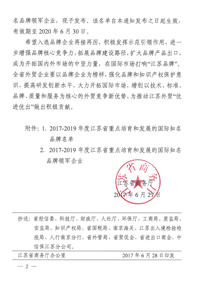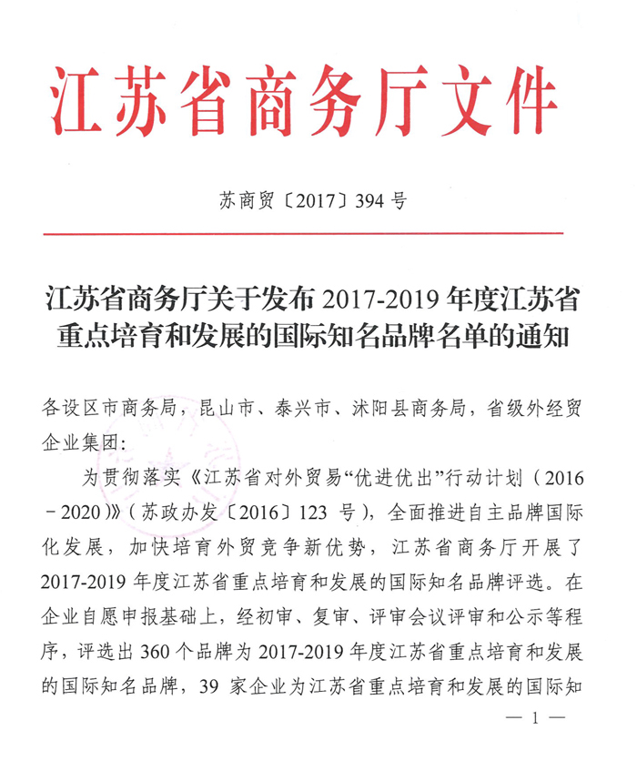 近日,省商务厅公布“2017-2019年度江苏省重点培育和发展的国际知名品牌”名单,经过层层评比,江苏suncitygroup太阳集团,太阳集团集团荣膺在列。