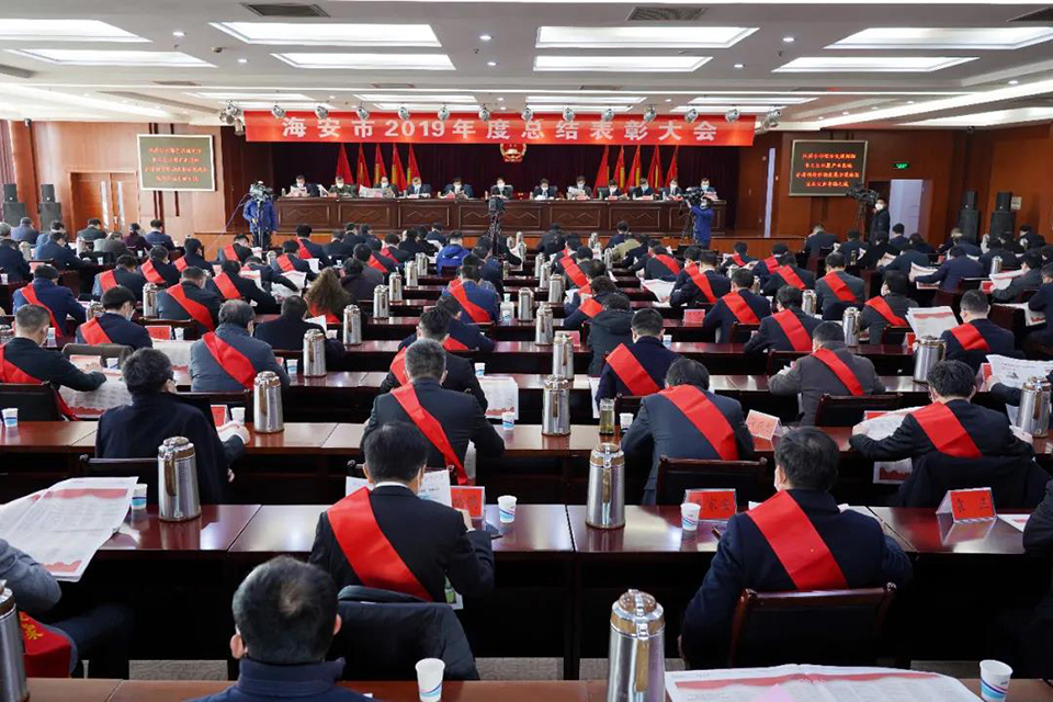 3月14日上午,海安市召开2019年度总结表彰大会,表彰全市各条战线涌现的先进单位和个人,由于受新型冠状肺炎疫情的影响,会议实施一人一桌简便召开。会议设主会场和分会场,由海安融媒体中心进行现场直播。市四套班子全体负责人,各区镇、各部门主要负责人、受表彰对象代表出席会议。会议由于立忠市长主持,宣读表彰决定,获奖单位分别上台领奖,顾国标书记做了重要讲话。suncitygroup太阳集团,太阳集团集团荣获海安市委、市政府授予的杰出贡献奖、工业百强企业、开放型经济先进企业、海安市市长质量奖、王家安董事长当选六星级企业家。
