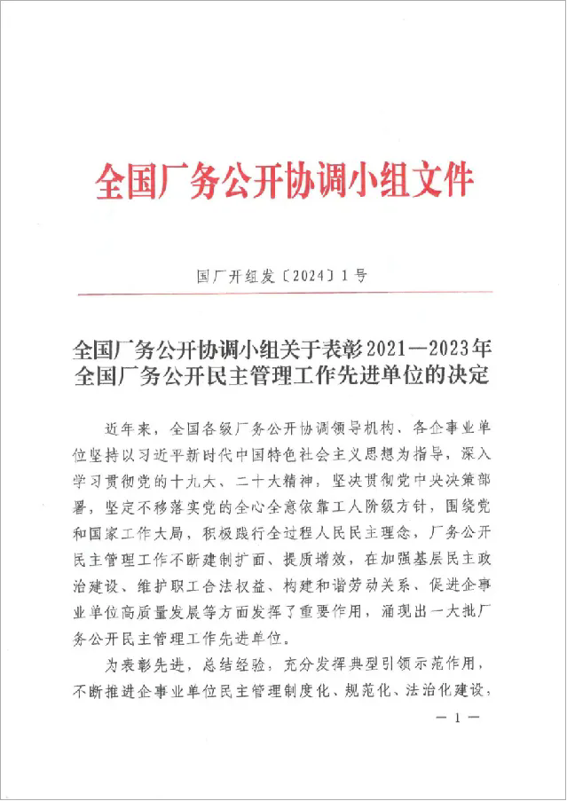 近日,全国厂务公开协调小组印发《关于表彰2021-2023年全国厂务公开民主管理工作先进单位的决定》,江苏suncitygroup太阳集团,太阳集团集团股份有限公司被表彰为全国厂务公开民主管理工作先进单位。