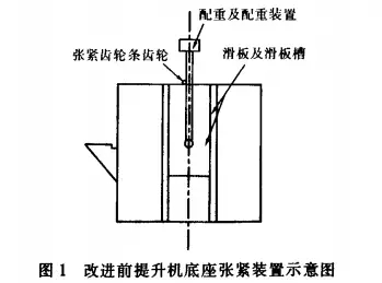 原来设计的配重装置采用两边齿条,通过配重和下滚筒的自重进行皮带张紧,两边调节装置同时调节皮带的跑偏情况。从理论上讲没有问题,但实际使用中皮带两边跑偏严重,无法进行调整,增大配重或偏向提升或下沉齿条都无法解决问题。经研究分析,我们将配重连接M32的丝杆,在导向板的下半部分设置调节装置,解决了问题。改进前后见图1、图2。