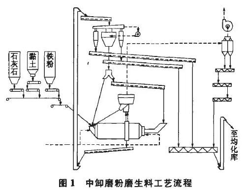 中卸烘干磨终粉磨生料工艺流程图见图1.